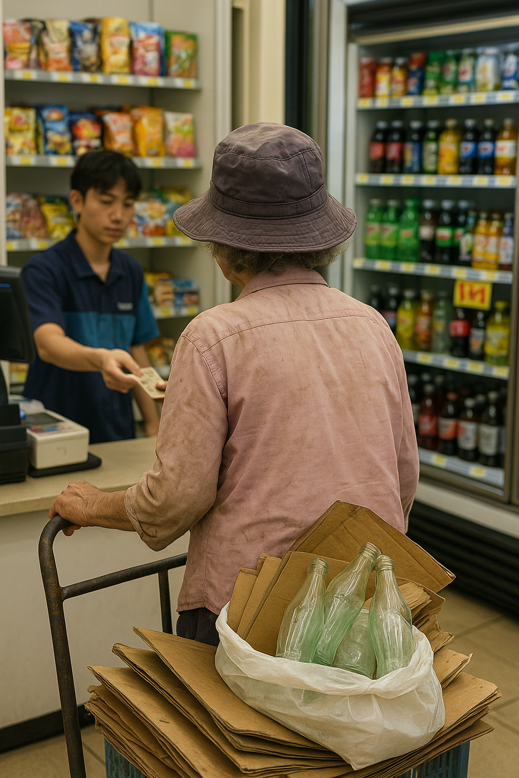 편의점 문이 열리고,낡은 모자와 해진 옷차림의 할머니가 들어오셨다.손에는 구겨진 폐지 뭉치와 비닐봉지에 담긴 빈 병들이 가득했다.그분의 손등은 햇볕에 그을려 거칠었고,팔에는 땀방울이 굵게 맺혀 있었다.그 무게는 가벼울지 몰라도,그 걸음에는 세월과 하루하루의 무게가 짙게 묻어 있었다. 편의점 카운터에 봉지를 올려놓자,점원이 무표정하게 병과 캔을 세기 시작했다.몇 초 후,“1,280원입니다.”짧은 말과 함께 건네진 천 원짜리 한 장과 동전 몇 개. 그 순간, 나는 아이스크림 코너 앞에 서 있었다.2+1 행사로 9천 원짜리 아이스크림을 고르고 있었다.순간, 이상한 기분이 나를 덮쳤다.‘나는 지금 돈도 안 벌고 있는데, 이런 걸 사 먹어도 되나?’그리고 곧, 할머니의 손에 쥐어진 천 몇백 원이 떠올랐다. 그 돈..