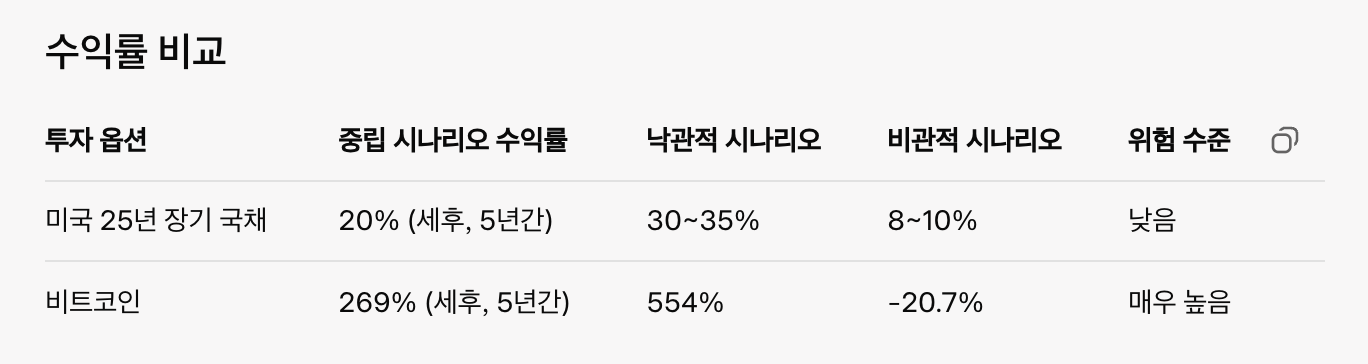 10억으로 평생 먹고 살기? 미국 장기 국채 vs 부동산·비트코인 최근 미국 장기(25년) 국채 금리가 7%를 넘어섰다. 단순 계산으로 10억 원을 여기에 투자하면, 매년 세후 약 6천만 원 정도의 이자를 받을 수 있다. 은행 예금 이자와 비교하면 상당히 높은 수준이다. 이렇게만 보면 굳이 사업을 하거나 땅을 사서 임대 수익을 올릴 필요 없이, 장기 국채를 매입해 안정적인 이자로 평생 생활비를 마련할 수 있겠다는 생각이 든다. 안정적인 국채 vs 성장성 있는 자산 반면, 우량주나 비트코인을 보유한다면 장기적으로 우상향할 가능성이 있지만, 당장 생활비로 쓸 수 있는 현금 흐름은 없다. 생활비를 만들려면 주식을 팔거나 비트코인을 매도해야 한다. 즉, 자산을 ‘묻어두는’ 전략이 될 수밖에 없다. 미래 가치..